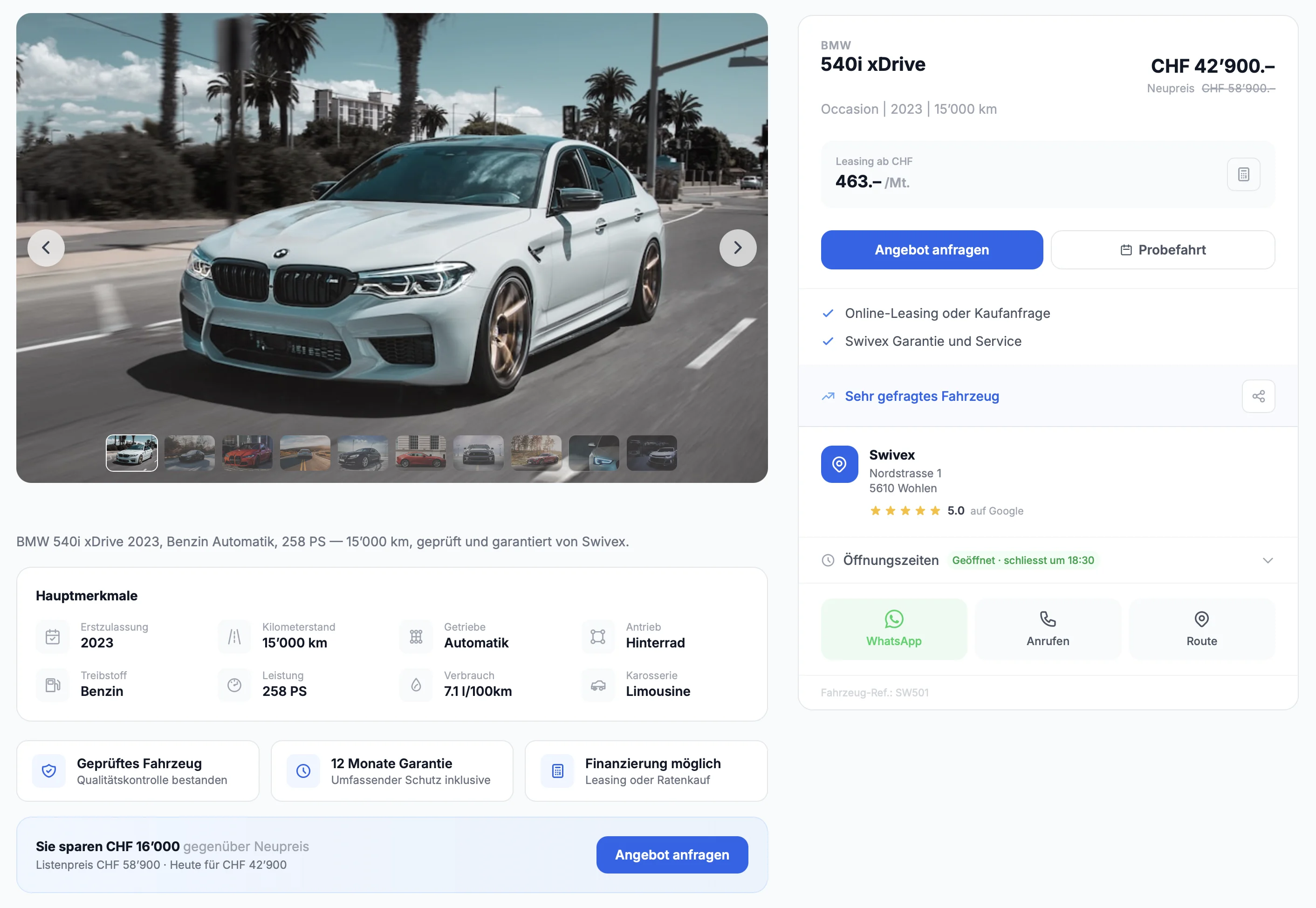 Jedes Fahrzeug bekommt eine eigene Seite auf Ihrer Website. Das heisst: Sie können Werbung direkt auf ein bestimmtes Auto schalten, auf Google, Social Media oder per Link in einer WhatsApp-Nachricht an einen Kunden.