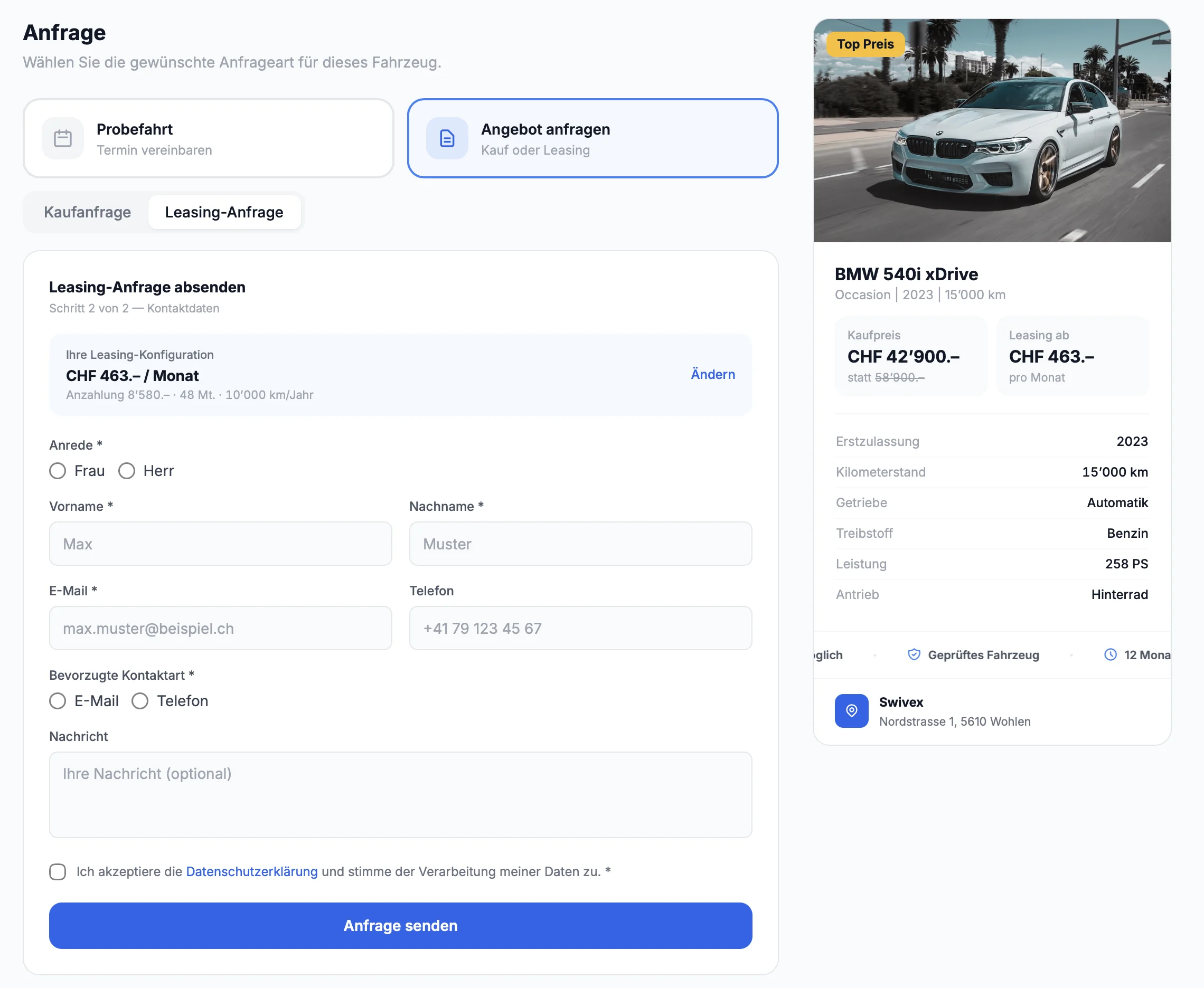 Jede Aktion im Showroom wird zu einem strukturierten Lead. Fahrzeug, Kundenwunsch, Kontaktdaten. Alles ist da, wenn Ihr Verkäufer den Lead öffnet.