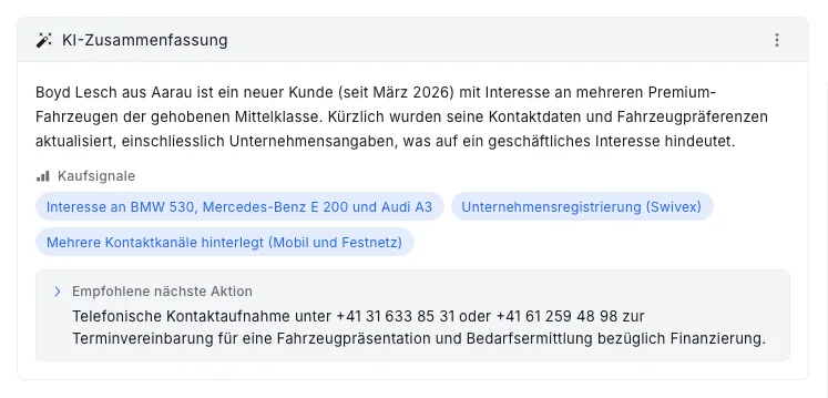 Verträge, Ausweise und wichtige Unterlagen, alles beim Kunden abgelegt. Dazu Notizen und Erinnerungen wie «Montag anrufen» oder «bevorzugt SUV». Nichts geht verloren, das ganze Team sieht alles.