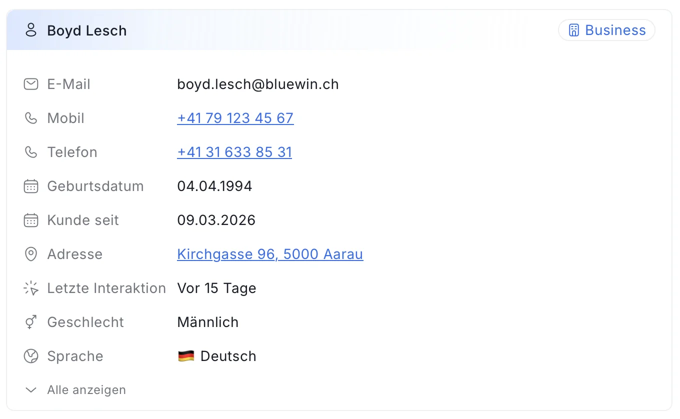 Jeder Kunde in Swivex hat sein eigenes Profil: Telefonnummer, Adresse, gekaufte Autos, Leasing-Verträge mit Laufzeit, monatlicher Rate und offenem Betrag bei der Bank, alle Anfragen, Notizen, Erinnerungen und Dokumente. Das ganze Team sieht alles auf einen Blick.