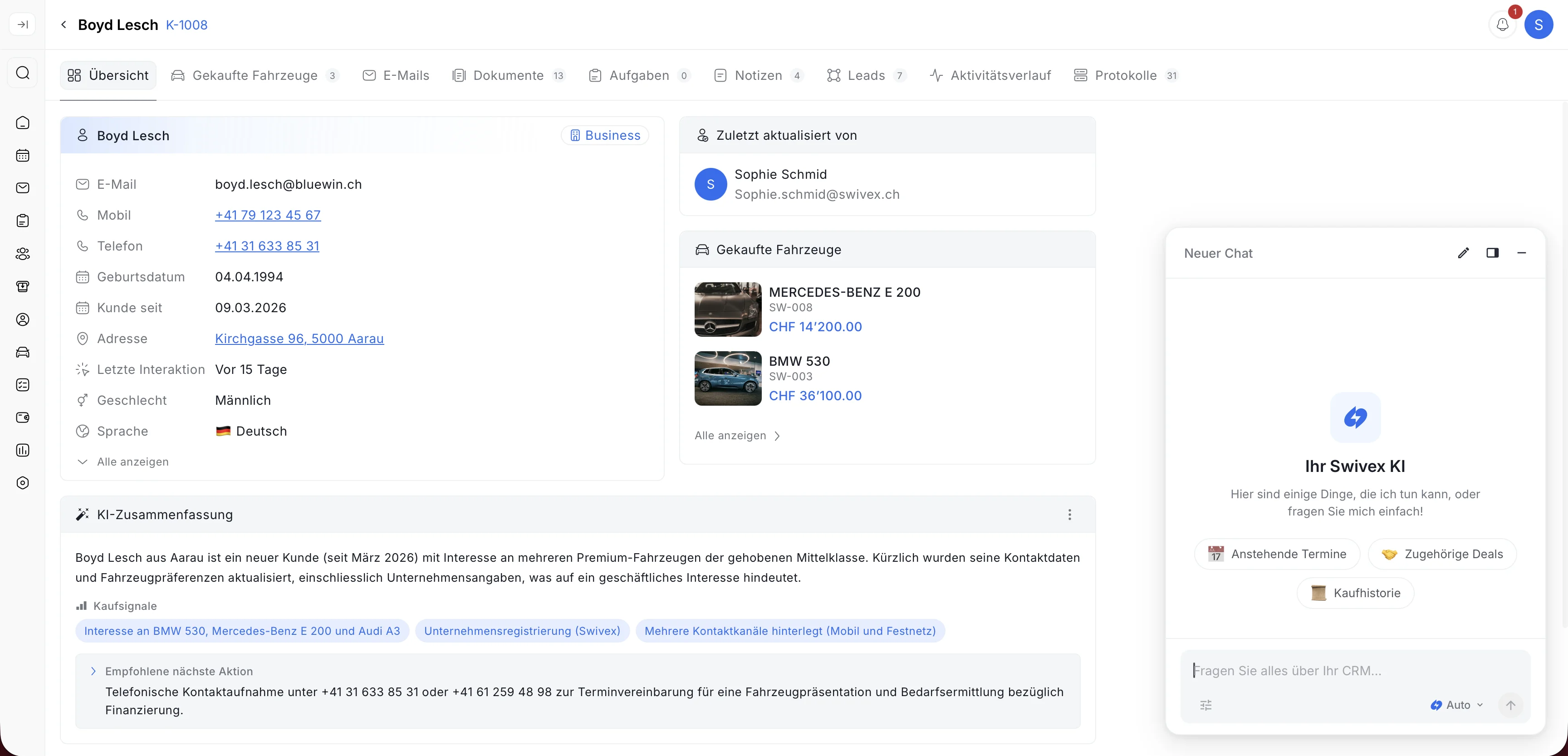 Telefonnummer, E-Mails, gekaufte Autos, Leasing-Verträge, Anfragen, Dokumente und Notizen: alles an einem Ort, automatisch aktualisiert.
